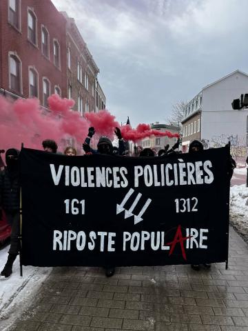 Québec, 15 mars 2026 - Profitant de l’occasion de la Journée internationale contre la brutalité policière, la Coalition pour le droit de manifester à Québec et ses allié·e·s ont pris la rue pour dénoncer les pratiques policières entretenant du  profilage racial, social et/ou politique ainsi que le port de la Thin blue line sur l’uniforme des représentant·e·s des forces de l’ordre. La Coalition dénonce le refus de l’administration Marchand d’y voir un réel problème, refus qu’elle associe à une tolérance des pratiques de surveillance, de discrimination ou de surjudiciarisation de sa part. Pour la Coalition, ces pratiques sont de l’ordre de violences institutionnelles qui ciblent les personnes contestataires, racisées ou marginalisées.