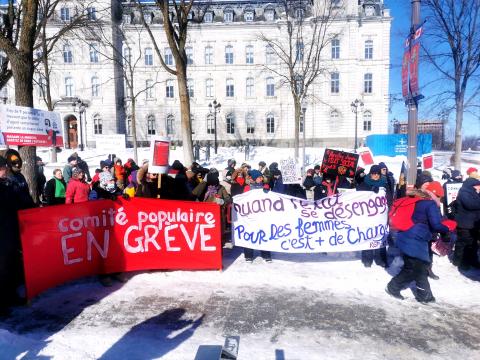 Des membres du Comité populaire se sont mobilisé·e·s durant cette journée. À partir de 8h le matin, une action de piquetage et de visibilité a eu lieu au coin des rues Saint-Jean et Sainte-Claire. Par la suite, une délégation s’est dirigée vers le Conseil du Trésor pour participer à une action de visibilité carnavalesque. La journée s’est terminée avec une manifestation large dans les rues de la Haute-Ville de Québec.