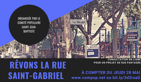 Le Comité populaire Saint-Jean-Baptiste vous invite à participer à sa consultation en ligne afin de rêver la rue Saint-Gabriel et d’avoir vos idées concernant une éventuelle rue partagée. Que voulons-nous pour la rue Saint-Gabriel afin d’y améliorer nos conditions de vie et notre quartier ? Pour remplir le questionnaire de dix questions, c'est ici que ça se passe : https://fr.surveymonkey.com/r/6PD93P7