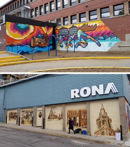 Par Fabien Abitbol Diverses fresques ont fleuri cet été dans le quartier. Au moins trois pour l'instant, dont deux à moins de deux-cents mètres l'une de l'autre... « Faut bien garder un peu de mystère dans cette ville » : c'est ainsi que Phelipe Soldevila répond à la question de savoir pourquoi, une fois de plus, on voit des chiens sur la murale d'angle qu'il a réalisée au sein du petit parc à jeux jeux derrière l'école Saint-Jean-Baptiste, côté d'Aiguillon. Bien que révélé au monde entier voici deux ans lorsque Apple lançait son iPhone 6, l'artiste-muraliste du quartier conserve pour lui ses recettes. De son côté, Cassandre Bernier, qui poursuit ses études à l'Université Laval dans le but d'enseigner les arts plastiques, s'est de nouveau attaquée au bâtiment de la Quincaillerie Saint-Jean-Baptiste. Après avoir travaillé l'an passé avec des élèves de l'école (sur le mur arrière rue Richelieu), elle s'est mise à l'ouvrage cette fois sur la rue Sutherland. Des dessins couleur ocre et sépia du plus bel effet pour rendre hommage au quartier, à son histoire, et aussi à son caractère plus anecdotique: la famille Dorval, du pompier au quincailler. Au total cinq grands panneaux et la porte. Un travail entamé le 21 juillet au soir et achevé après la rentrée des classes, car il fait bien aussi prendre un peu de vacances en été. === Extrait du numéro d'automne 2016 du journal l'Infobourg